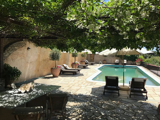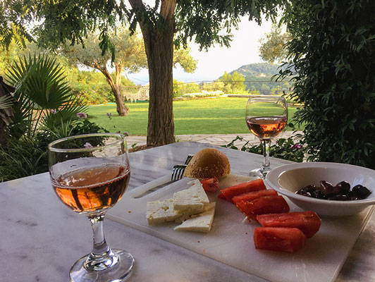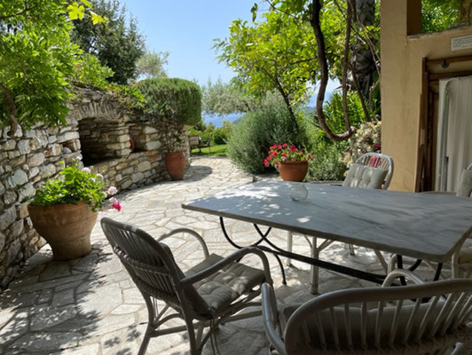 Die Haupt-Villa verfügt über vier wunderschön eingerichtete Studios und ein Apartment. Ihre Innenräume sind mit Terrakottafliesen, Marmor und Kiefer verkleidet. Die zweite Villa und das Haus befinden sich im Garten unterhalb des Haupthauses. Private Terrassen im Gartengeschoss, die von Jasmin, Glyzinien und Bougainvillea gesäumt sind, bieten Blick auf das Meer, zu den Bergen und den dahinterliegenden Inseln.